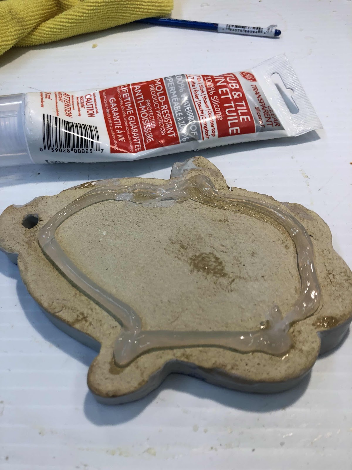 Here I am putting a long running pad of silicon on the bottom of a 'hand of Fatima' that I wish to use on my kitchen counter as a spoon rest.
